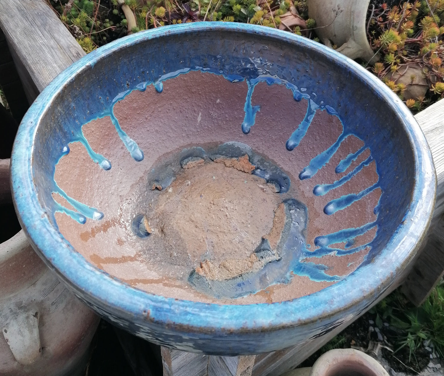 - Schöne große Schale aus winterfesten Steinzeug blaugrau glänzend glasiert mit kleinen Schönheitsfehlern